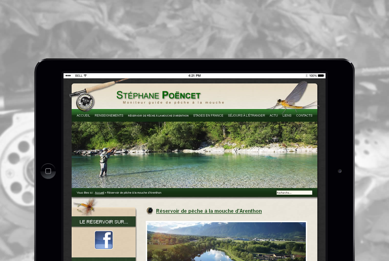 En 2010, Stéphane Poëncet m’a demandé de moderniser le design et l’ergonomie de son site internet vieillissant, tout en maintenant son bon référencement. Afin de lui permettre de gérer son site lui-même, j’ai créé un thème totalement sur mesure reflétant le monde de la pêche à la mouche et mis en place l’ensemble du site sur le gestionnaire de contenu Joomla. Divers modules et composants ont également dû être développés ou personnalisés. Une fois le site créé, validé et mis en ligne, j’ai formé Stéphane à son utilisation.