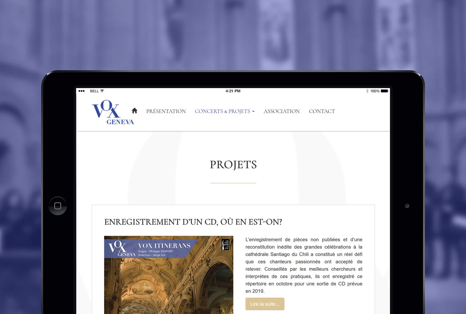 Dans le cadre de mon contrat chez l’agence de communication Crealis, j’ai eu pour mission de créer le site internet de Vox Geneva, destiné à présenter l’association et ses actualités.