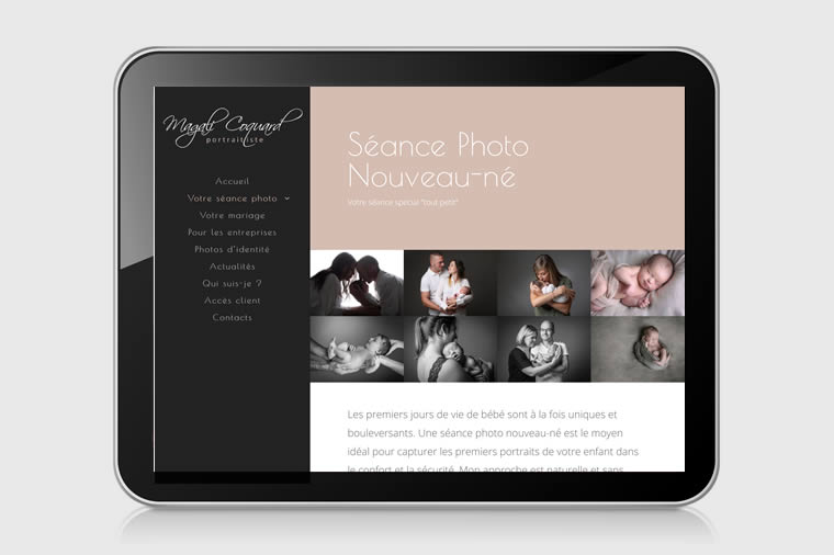 Afin de dynamiser son activité et de présenter son travail et les services proposés par son studio photo de la plus belle manière, Magali Coquard m’a confié la création de son site internet. Son site se veut donc sobre et faisant la part belle aux photos.